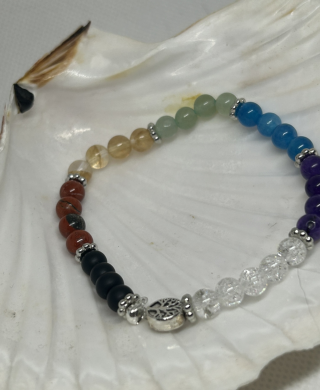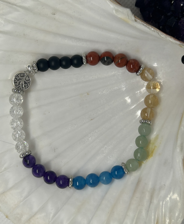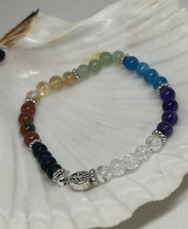 Ce bracelet 7 chakras harmonise l’ensemble des centres énergétiques grâce à la puissance combinée de pierres naturelles : Cristal de Roche flocon de neige (couronne – clarté), Améthyste (3e œil – intuition), Apatite Bleue (gorge – communication), Aventurine Verte (cœur – apaisement), Citrine (plexus solaire – confiance), Jaspe Rouge (racine – vitalité) et Onyx (protection et ancrage).