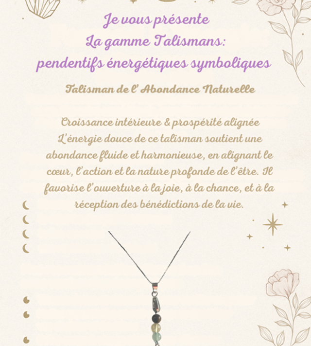 L’énergie douce de ce talisman soutient une abondance fluide et harmonieuse, en alignant le cœur, l’action et la nature profonde de l’être. Il favorise l’ouverture à la joie, à la chance, et à la réception des bénédictions de la vie.