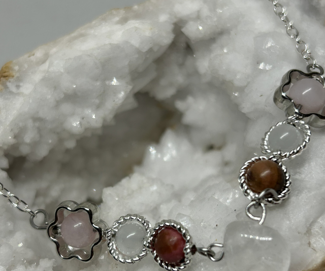Célébrez la féminité et soutenez Octobre Rose avec ce collier délicat. La pierre centrale en cristal de roche amplifie les énergies positives et la beauté des pierres qui l’entourent : quartz rose, rhodonite et pierre de lune blanche. Chaque pierre a été choisie pour ses vertus : le quartz rose apporte douceur et amour, la rhodonite soutient la guérison émotionnelle et le courage, et la pierre de lune blanche symbolise la féminité et l’intuition. Monté sur acier inoxydable argenté, ce bijou élégant et lumineux se porte au quotidien pour vous rappeler votre force intérieure et la beauté de chaque instant. Un collier porteur de sens, pensé pour honorer la douceur et le soutien des femmes.