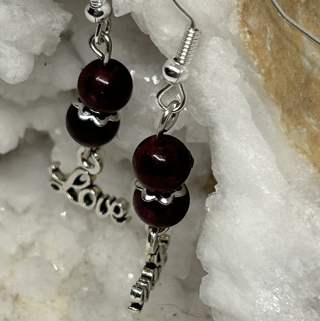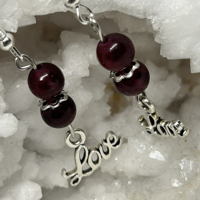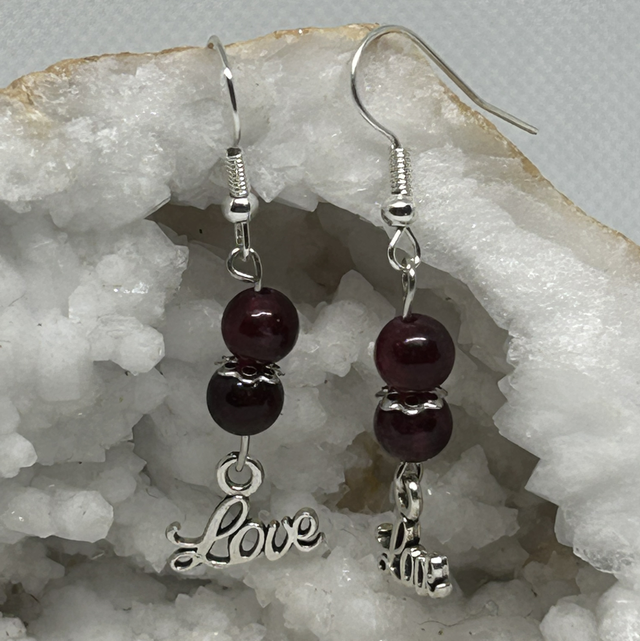 💎 Boucles d’oreilles en acier inoxydable argenté, perle de Grenat & breloque “Love” — Vitalité & Énergie du Cœur