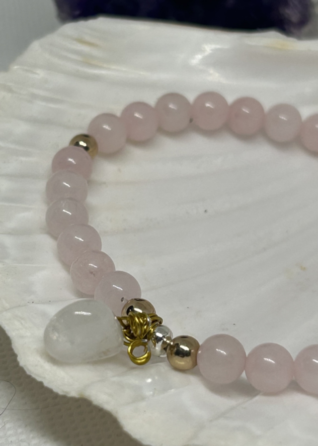 le bracelet est orné d’une goutte en cristal de roche qui augmente les effets du quartz rose.