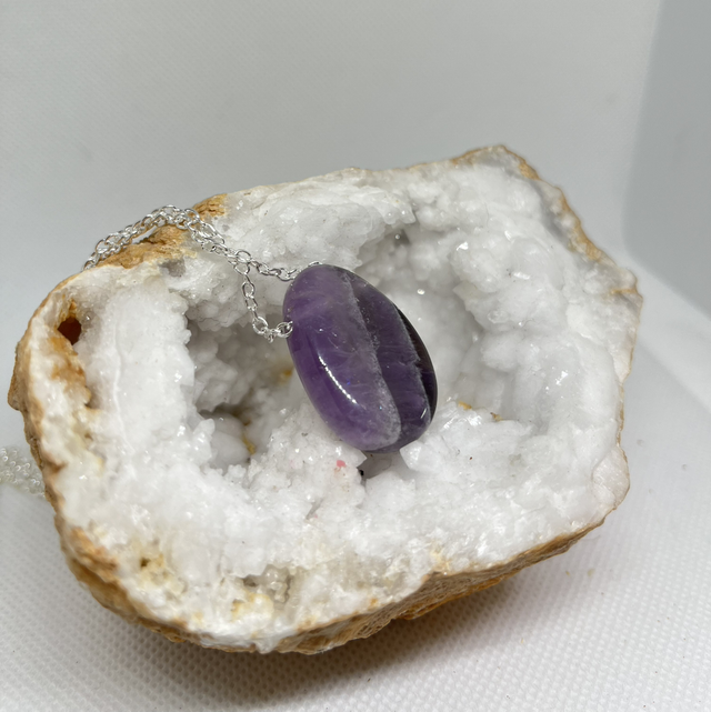 Laissez-vous séduire par l’élégance de ce collier en chaîne argentée inoxydable, sublimé par une véritable pierre d’améthyste, soigneusement sélectionnée pour sa beauté naturelle et ses puissantes vertus énergétiques.
